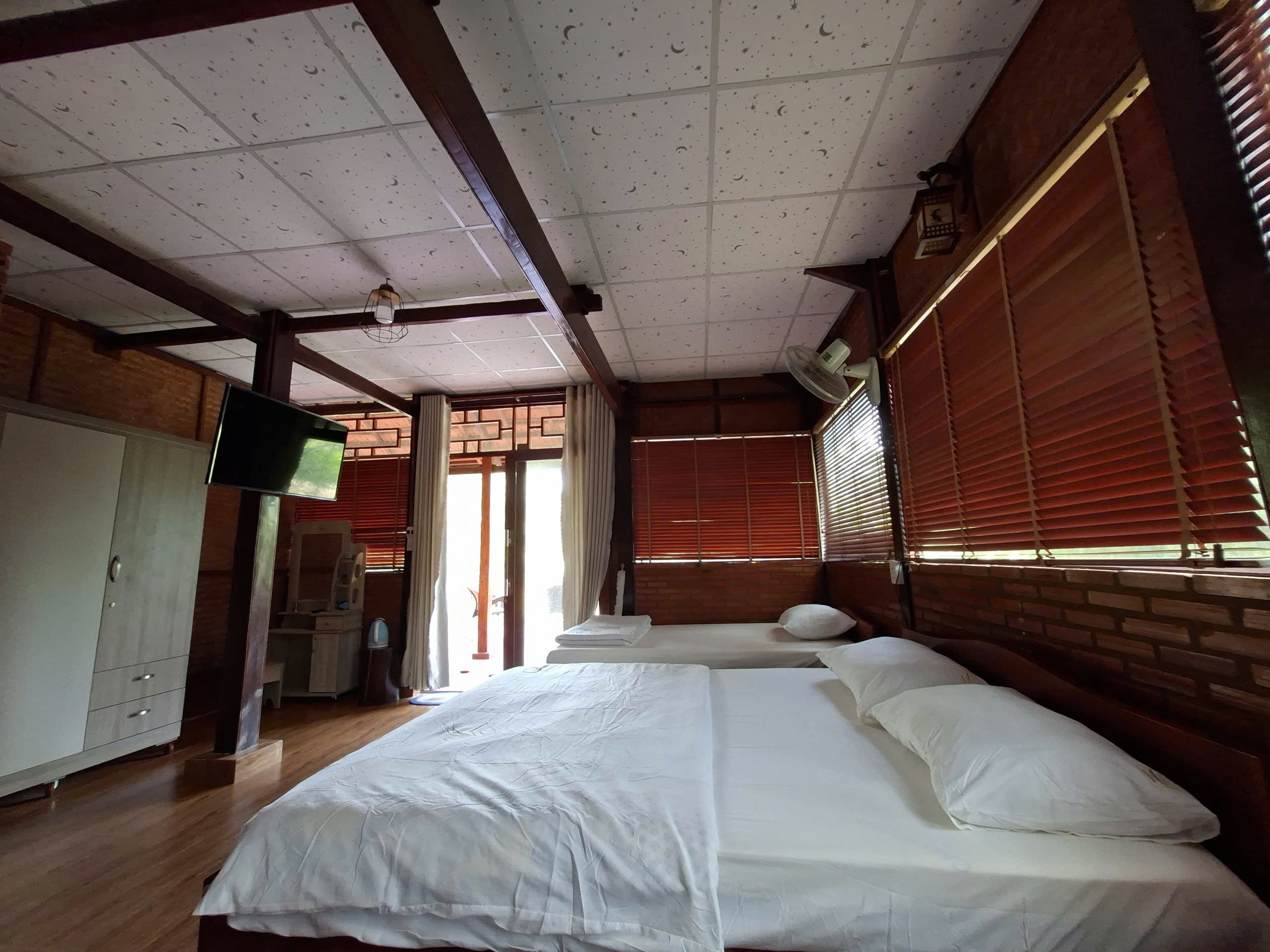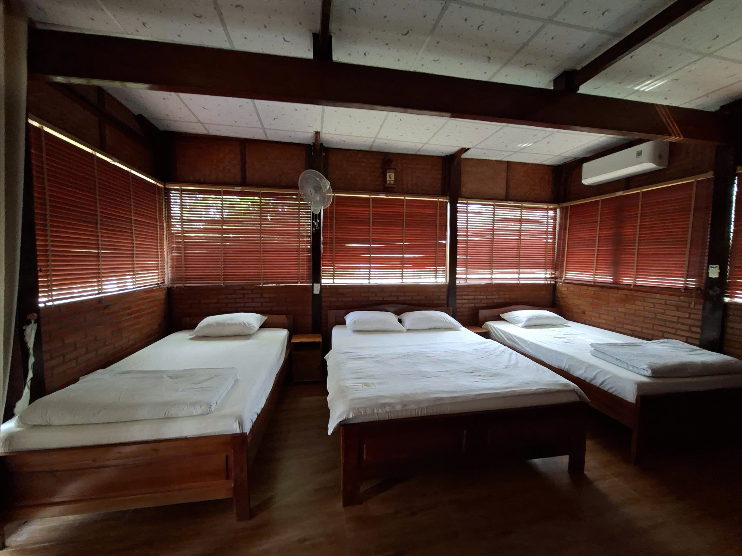 Phòng được thiết kế rộng rãi, thoáng đãng với 2 giường đơn và 1 giường đôi, phù hợp cho từ 4–6 khách. Từ ban công hoặc cửa sổ, bạn có thể phóng tầm mắt ra dòng sông thơ mộng, lắng nghe tiếng nước chảy, tiếng chim rừng và cảm nhận trọn vẹn nhịp sống chậm rãi của Cát Tiên.